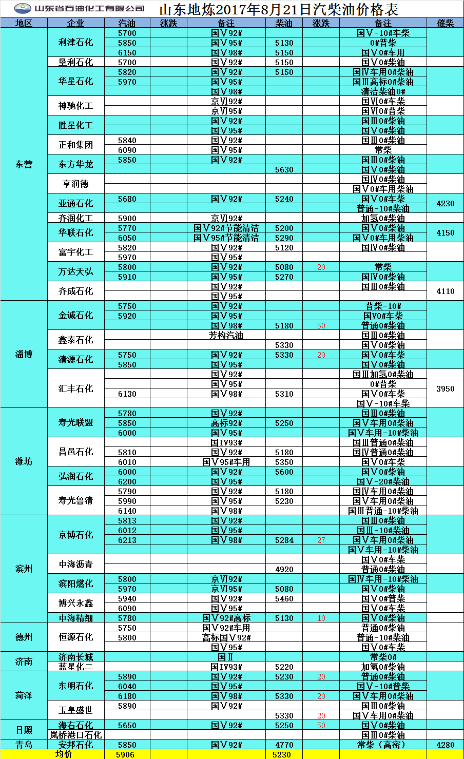 山東地?zé)?017年8月21日汽柴油價(jià)格表