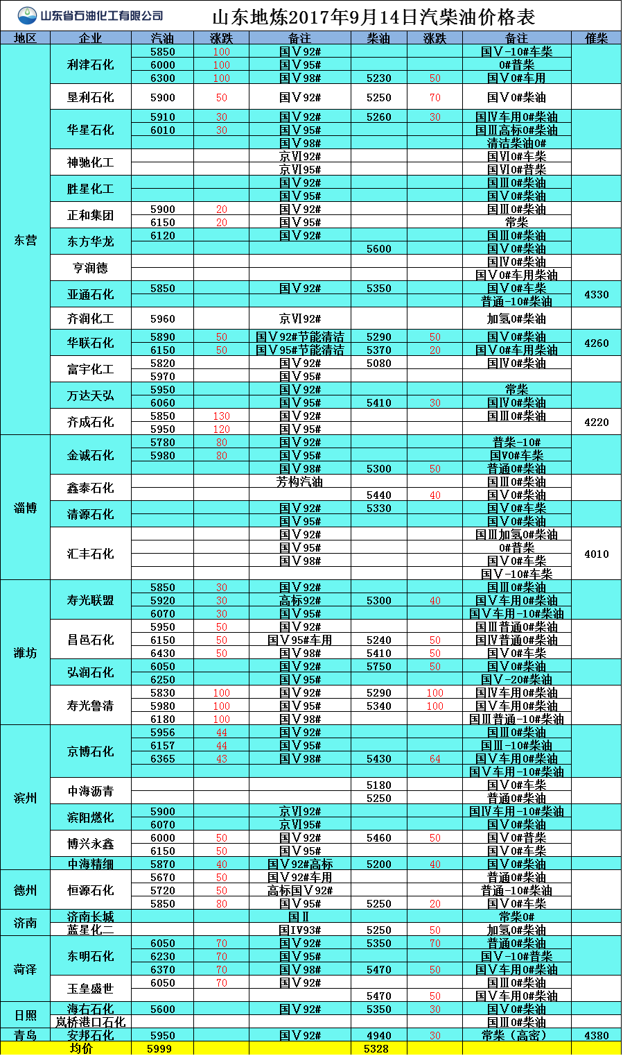山東地?zé)?017年9月14日汽柴油價(jià)格表