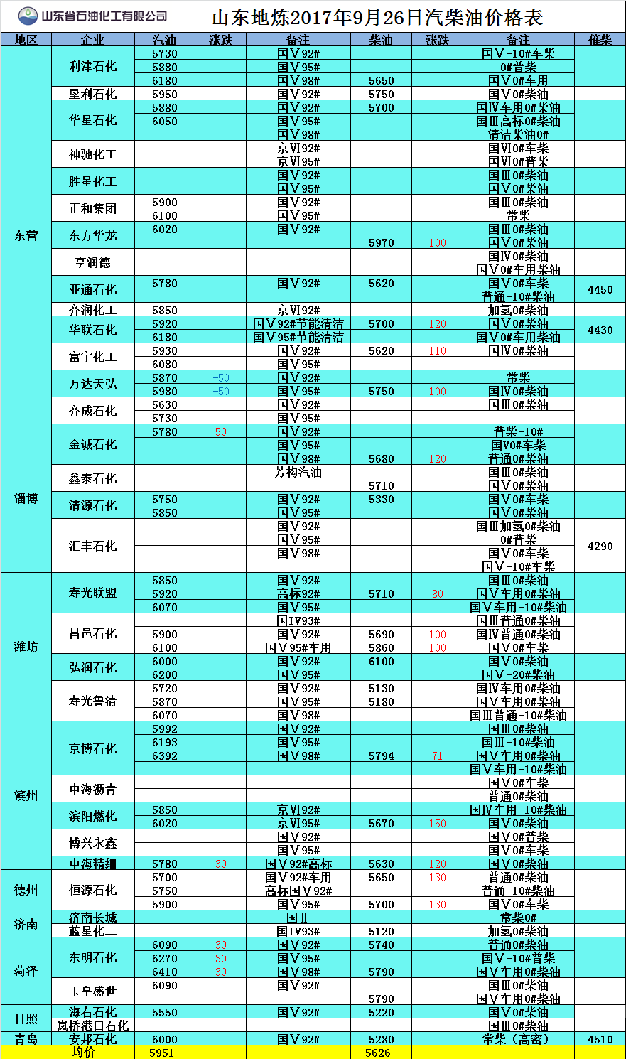 山東地?zé)?017年9月26日汽柴油價(jià)格表