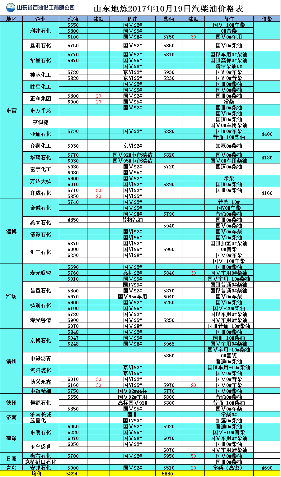 山東地?zé)?017年10月19日汽柴油價(jià)格表