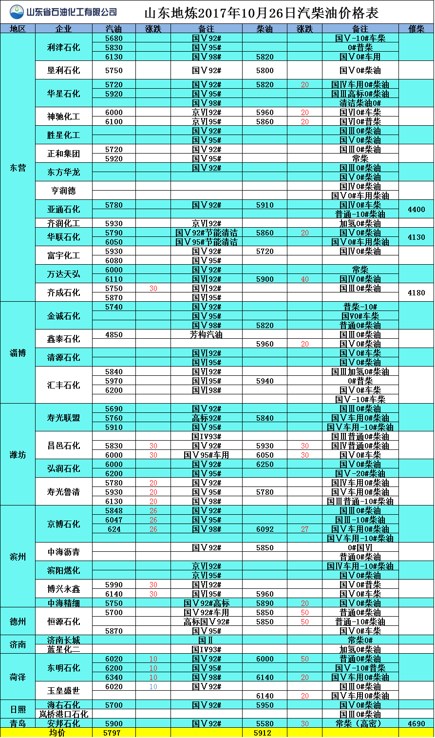 山東地?zé)?017年10月26日汽柴油價(jià)格表