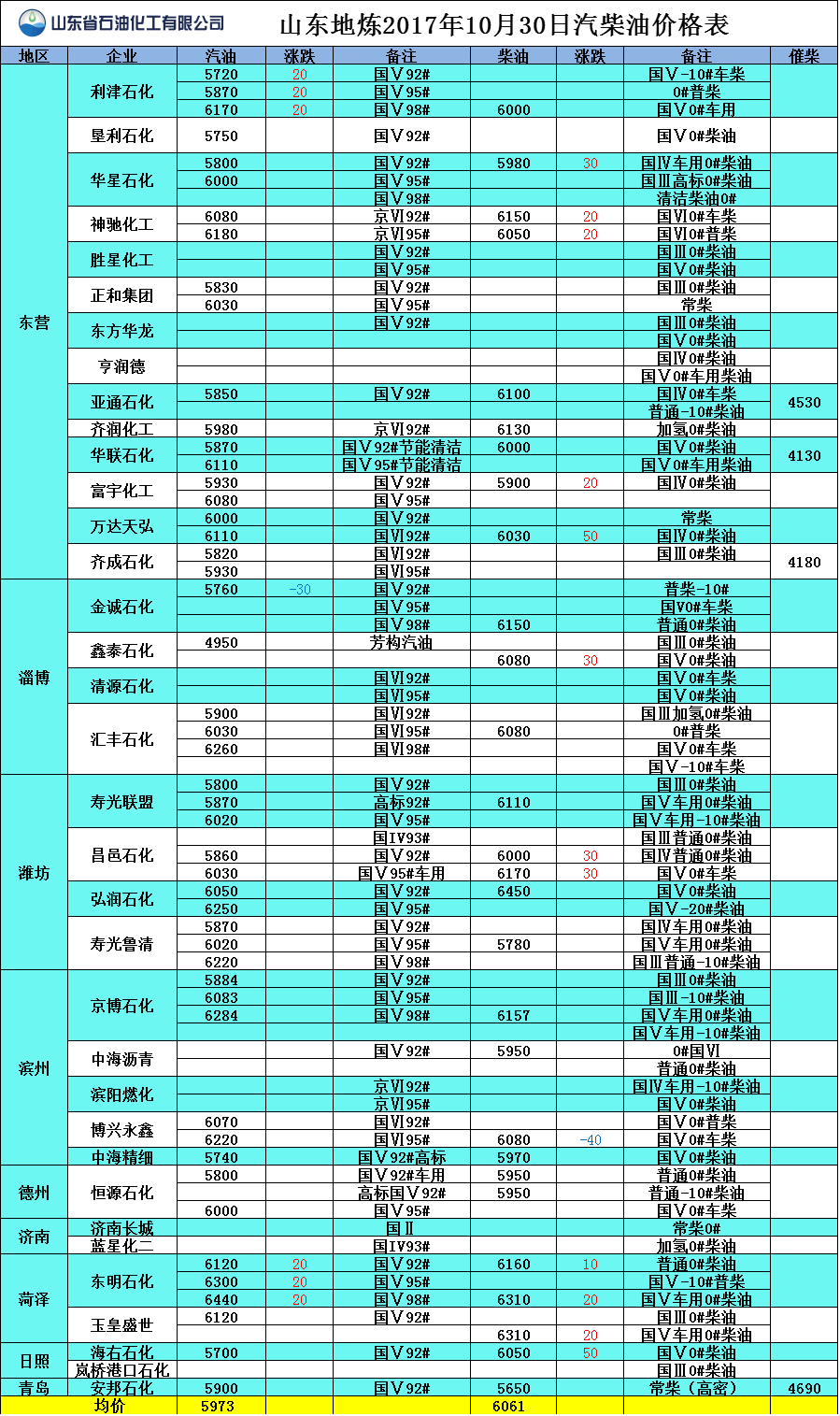 山東地?zé)?017年10月30日汽柴油價(jià)格表