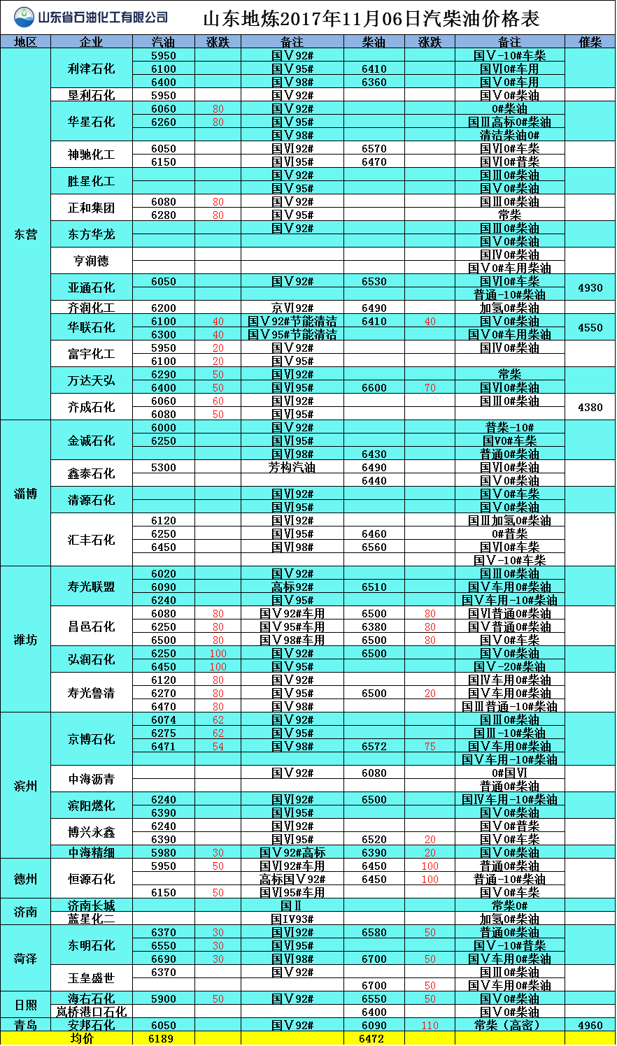 山東地?zé)?017年11月6日汽柴油價(jià)格表