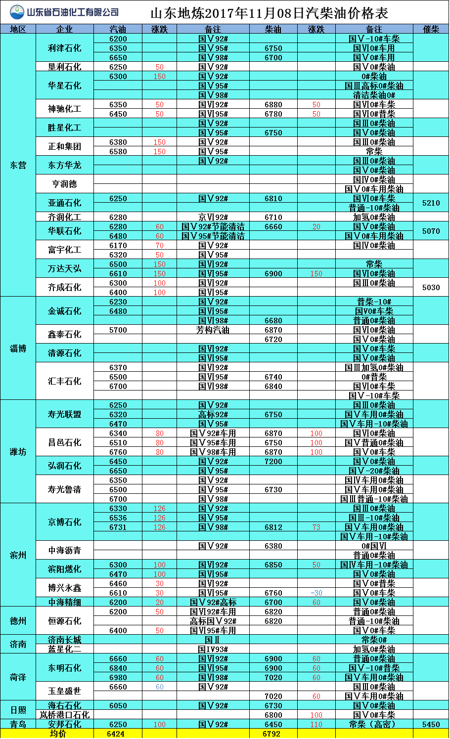 山東地?zé)?017年11月8日汽柴油價(jià)格表