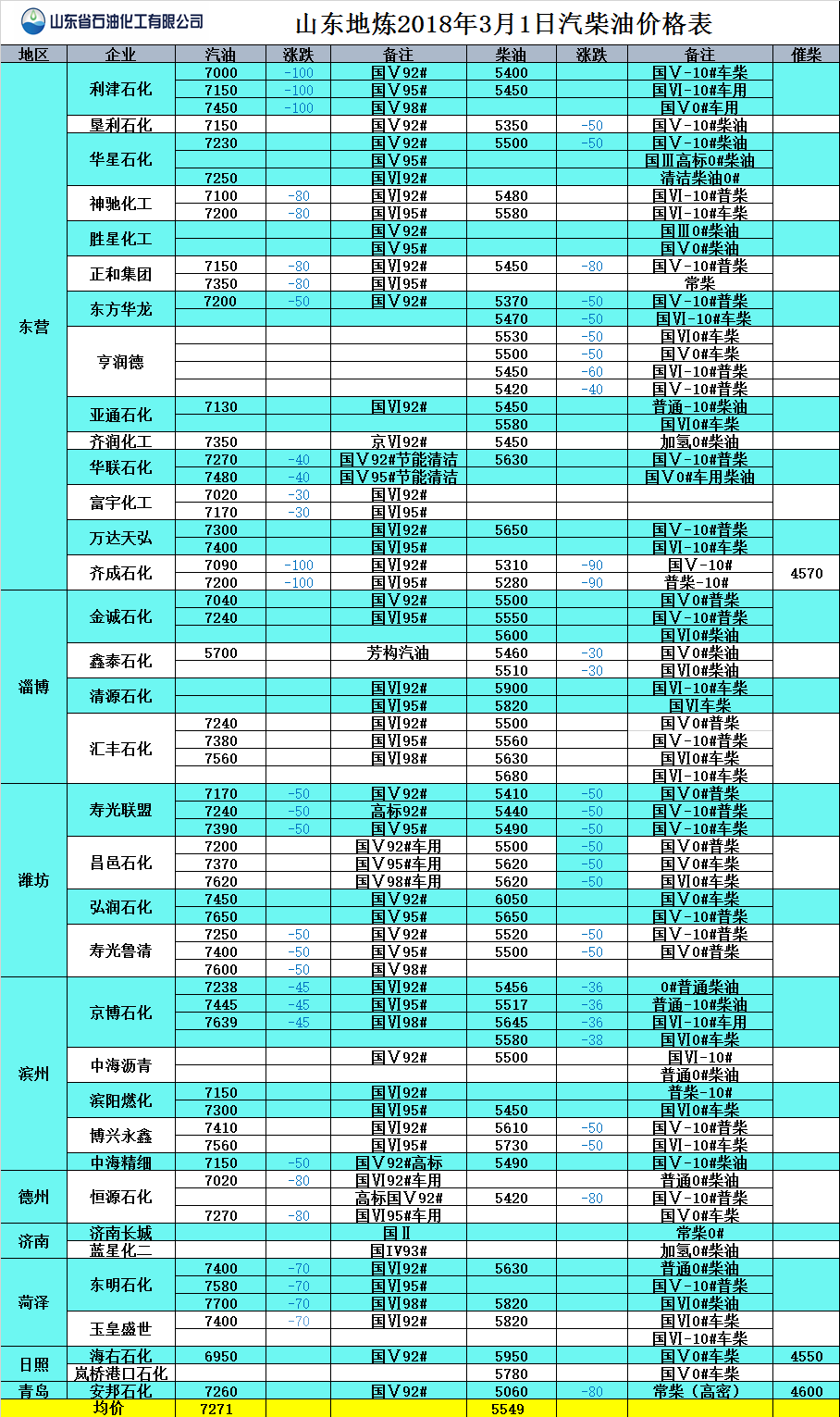 山東地?zé)?018年3月1日汽柴油價(jià)格表