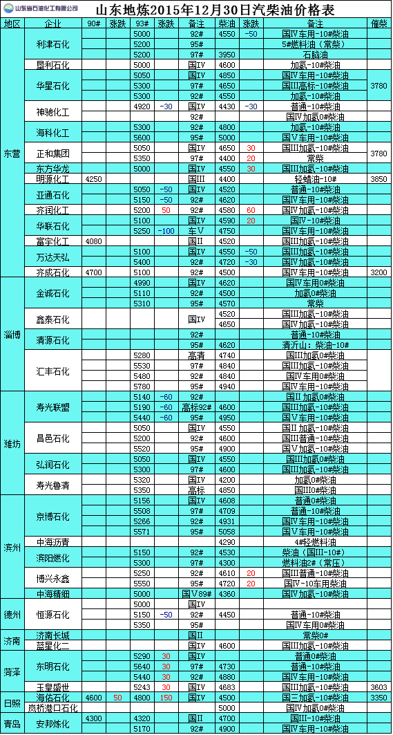 2015年12月30日山東地煉汽柴油價格表