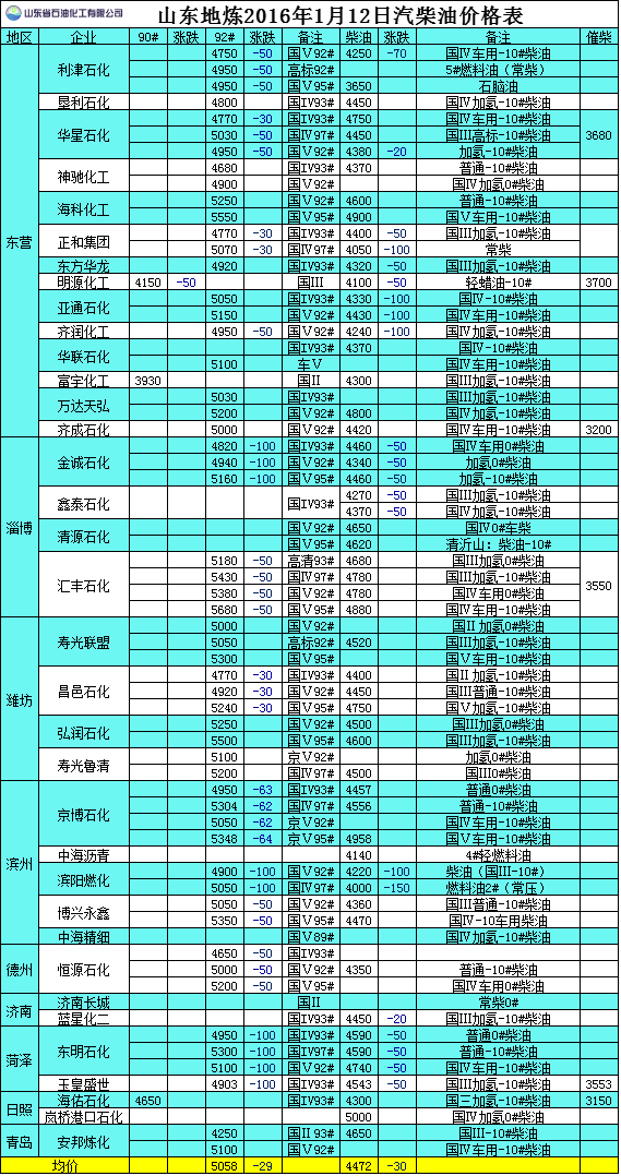 2016年1月12日山東地煉汽柴油價格表