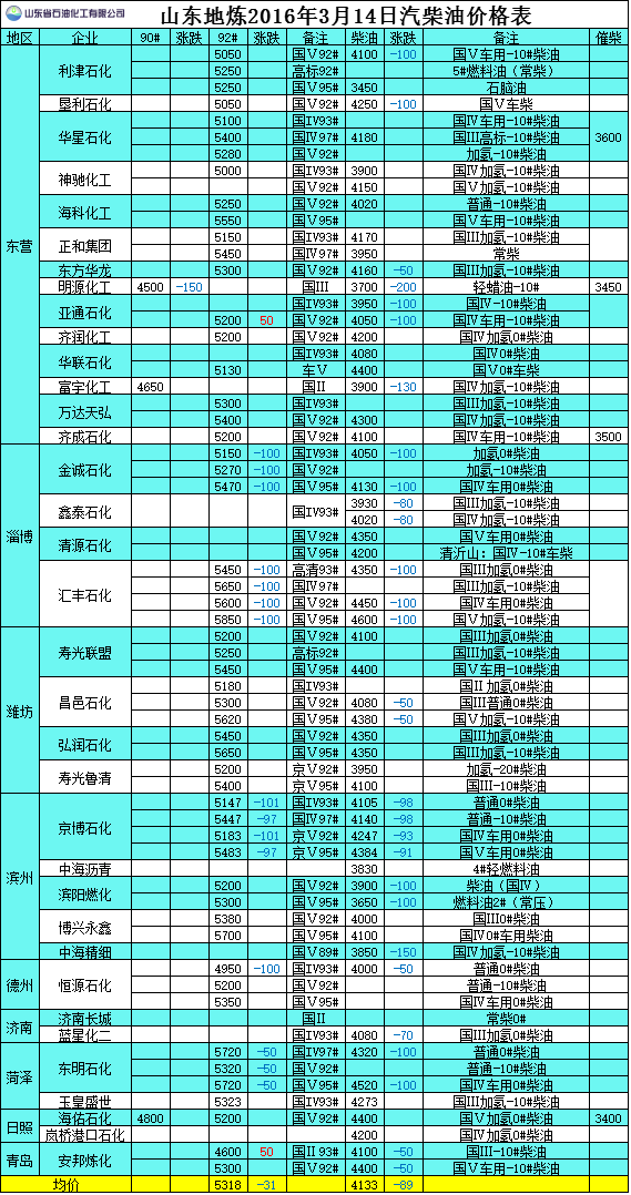 2016年3月14日山東地煉汽柴油價格表