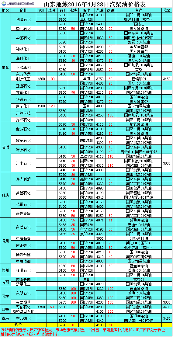 2016年4月28日山東地?zé)捚裼蛢r格表