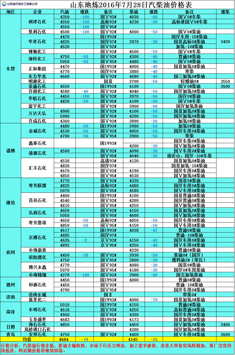 行情分析:汽柴油行情走低,原油大幅收跌,市場下行壓力明顯,加之需求疲軟,業(yè)者大單備貨風險增加,煉廠出貨持續(xù)低迷,料近期價格將繼續(xù)回落。