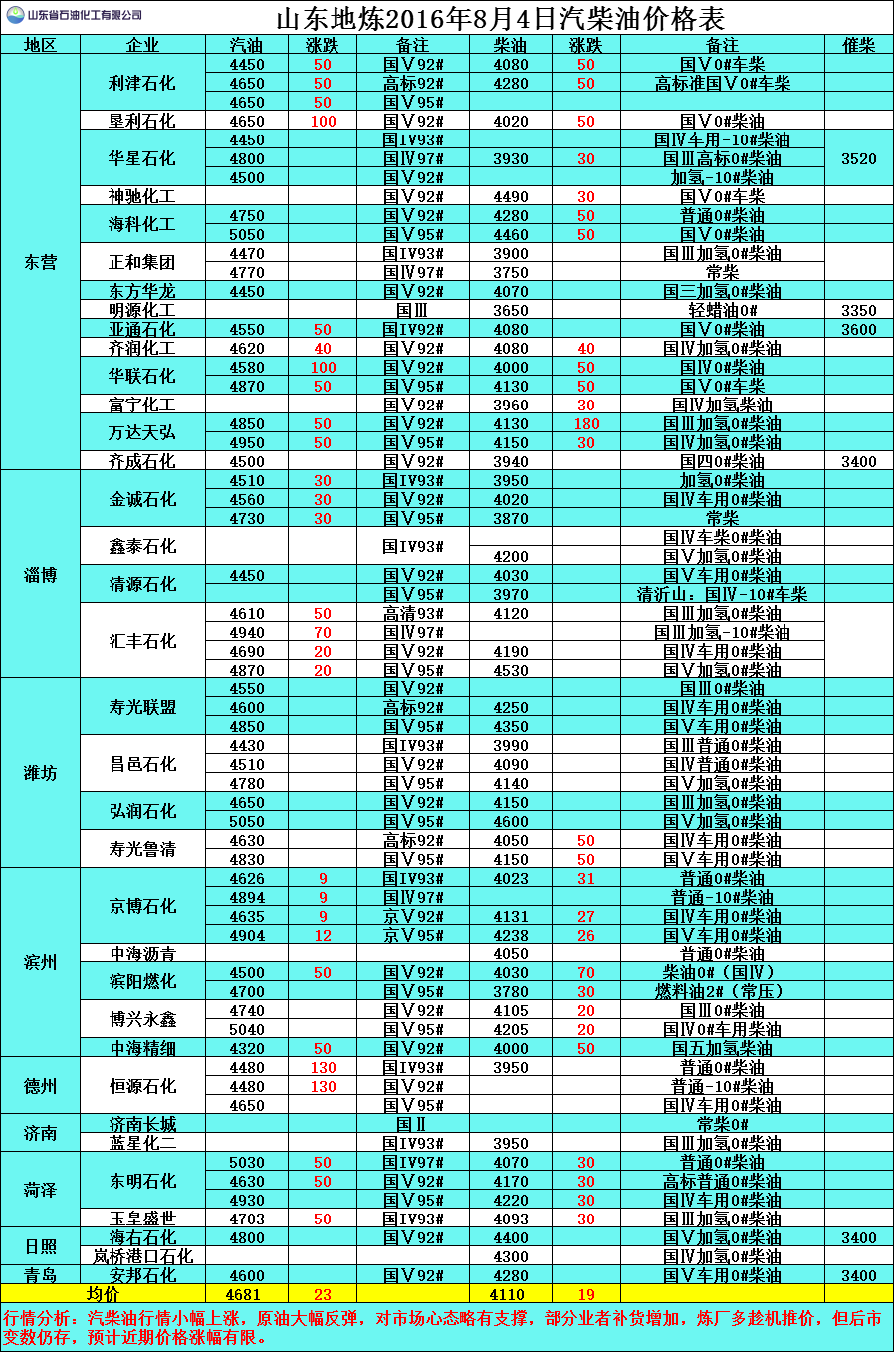 行情分析:汽柴油行情小幅上漲,原油大幅反彈,對市場心態(tài)略有支撐,部分業(yè)者補貨增加,煉廠多趁機推價,但后市變數(shù)仍存,預(yù)計近期價格漲幅有限。
