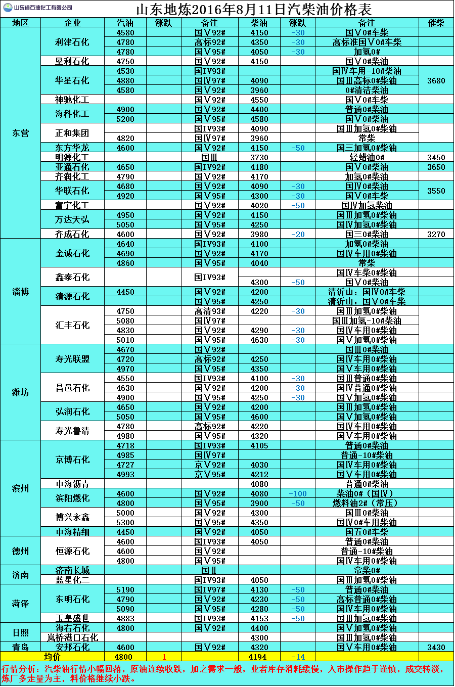 行情分析:汽柴油行情小幅回落,原油連續(xù)收跌,加之需求一般,業(yè)者庫存消耗緩慢,入市操作趨于謹(jǐn)慎,成交轉(zhuǎn)淡,煉廠多走量為主,料價格繼續(xù)小跌。