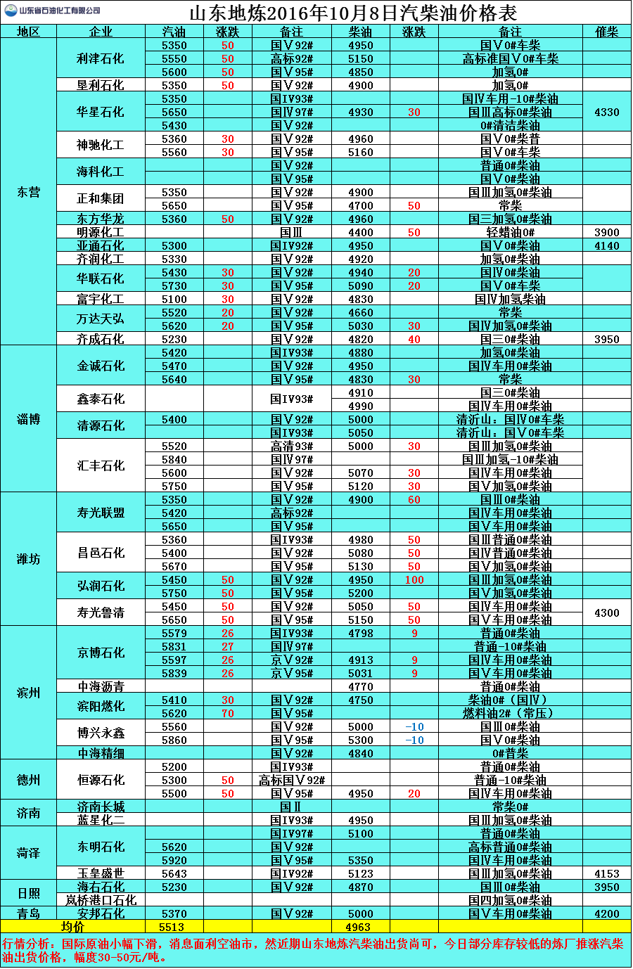 行情分析:國際原油小幅下滑,消息面利空油市,然近期山東地?zé)捚裼统鲐浬锌?,今日部分庫存較低的煉廠推漲汽柴油出貨價(jià)格,幅度30-50元/噸。