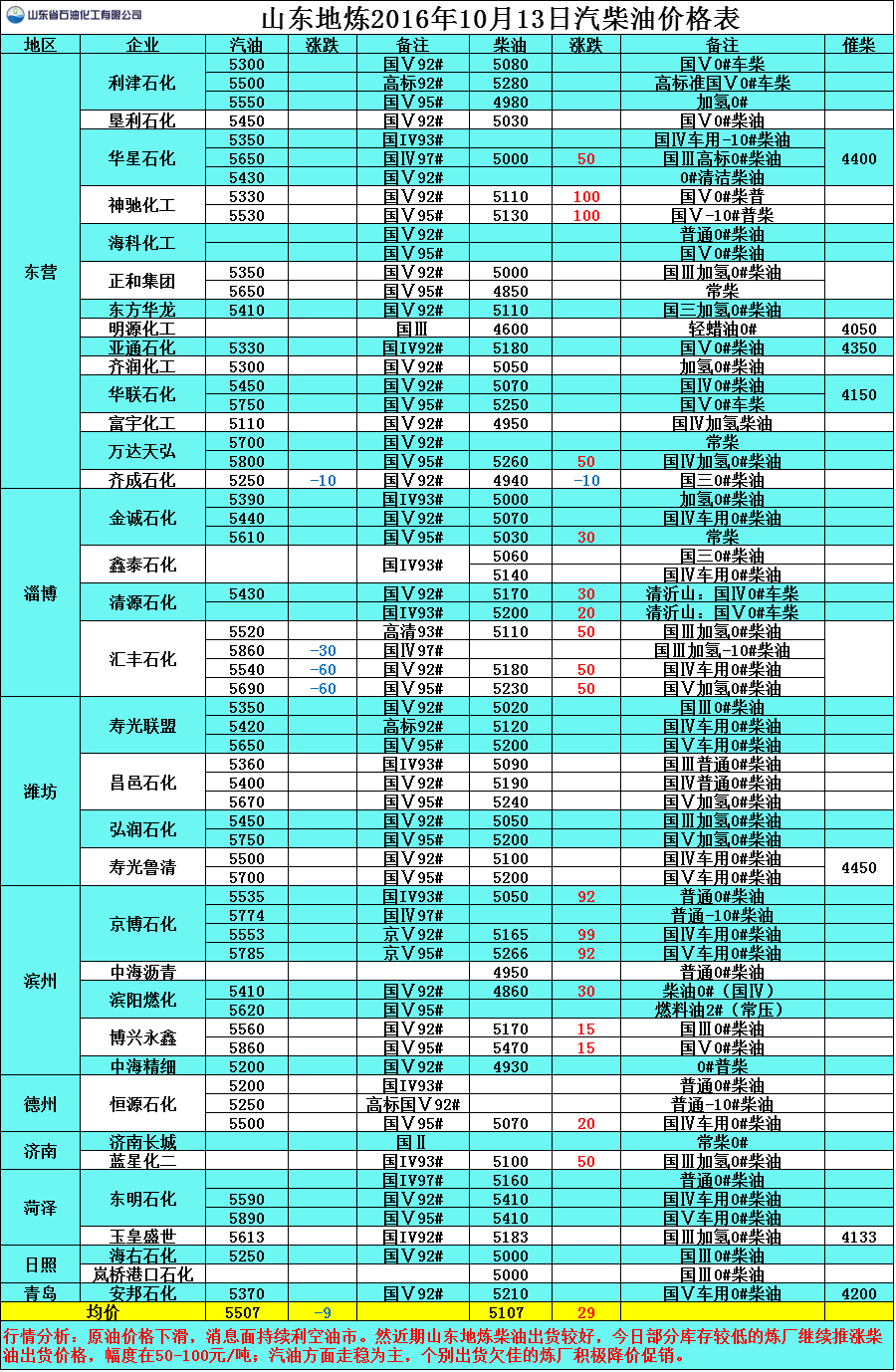 行情分析:原油價(jià)格下滑,消息面持續(xù)利空油市。然近期山東地?zé)挷裼统鲐涊^好,今日部分庫存較低的煉廠繼續(xù)推漲柴油出貨價(jià)格,幅度在50-100元/噸;汽油方面走穩(wěn)為主,個(gè)別出貨欠佳的煉廠積極降價(jià)促銷。