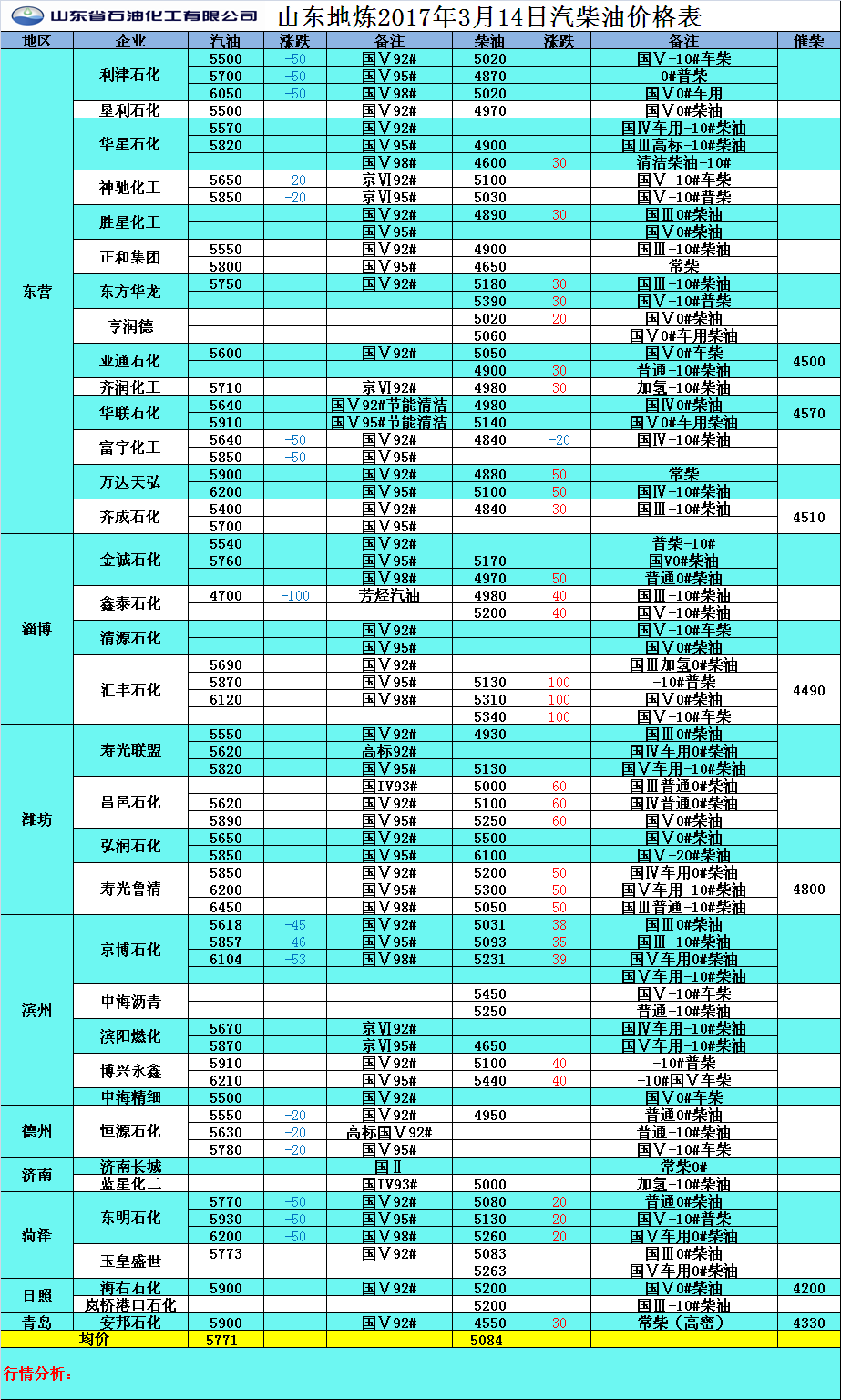 2017年3月14日山東地煉汽柴油價格