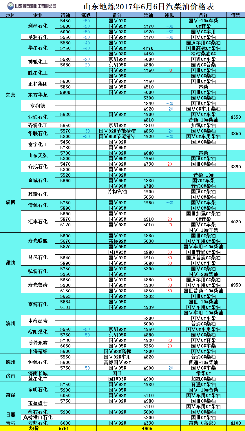 2017年6月6日山東地煉汽柴油價格