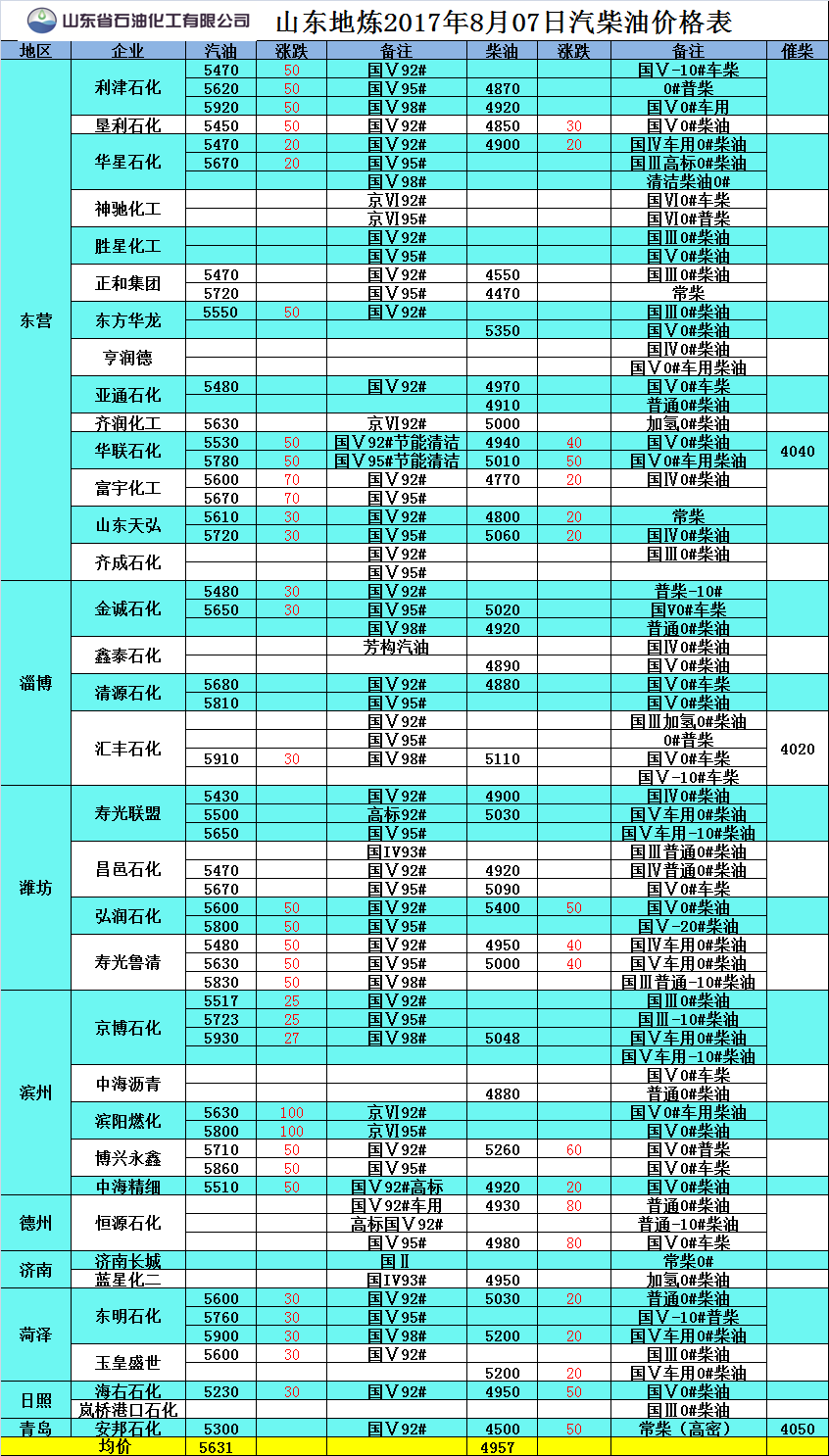 山東地?zé)?017年8月07日汽柴油價(jià)格表