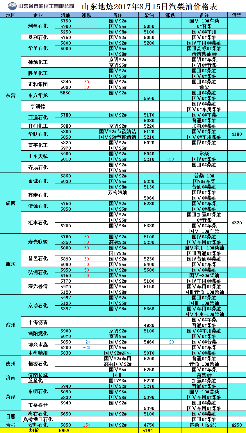 山東地?zé)?017年8月15日汽柴油價(jià)格表
